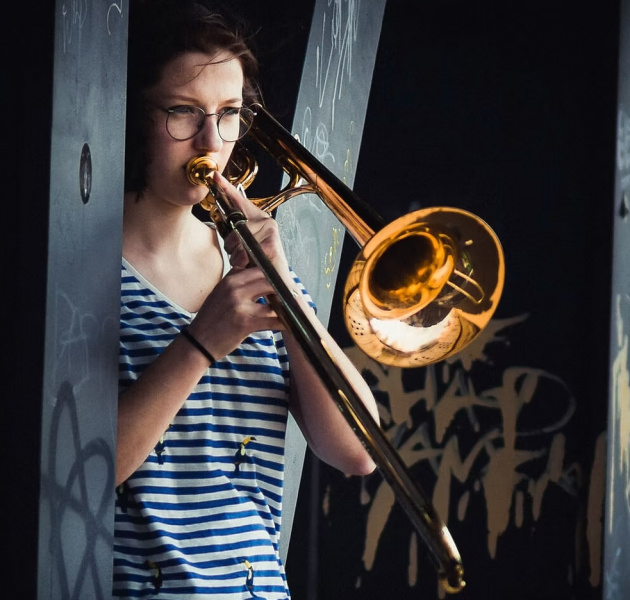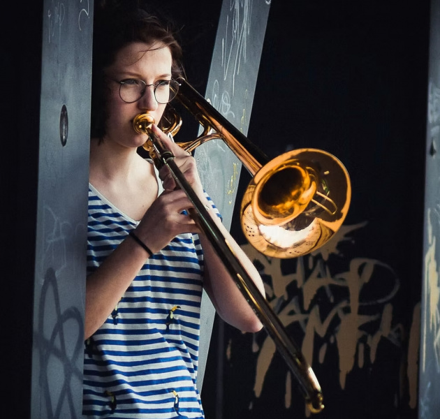 Sonja Beeh (1993) ist als Posaunistin, Komponistin, Arrangeurin und Pädagogin aktiv.